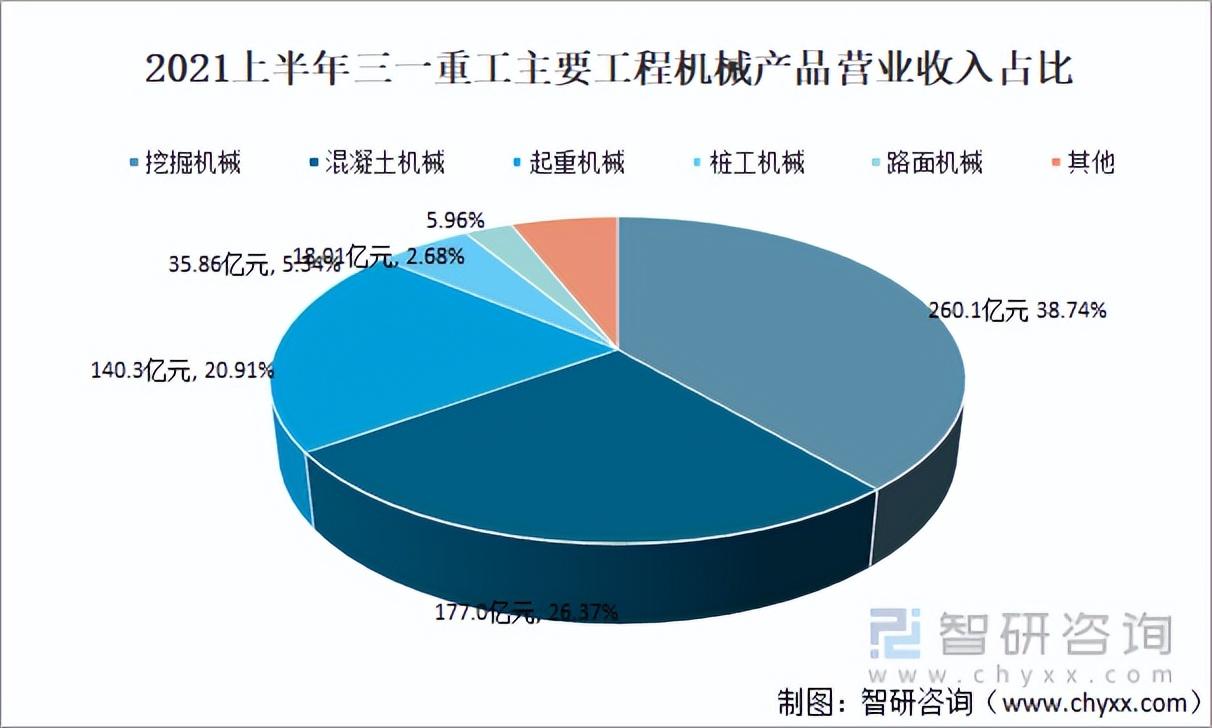 其中2021上半年三一重工-工程机械产品营业收入中挖掘机械营业收入为260.1亿元,占总营业收入的38.74%。