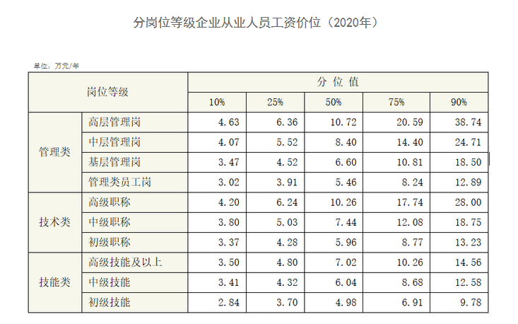 同时,企业薪酬调查信息,还有一份分岗位等级企业从业人员工资价位情况,这张表分为管理类岗位等级、技术类岗位等级、技能类岗位等级三类,从中可以看出,管理岗位越高、职称越高、技能越高,工资价位也就越高。