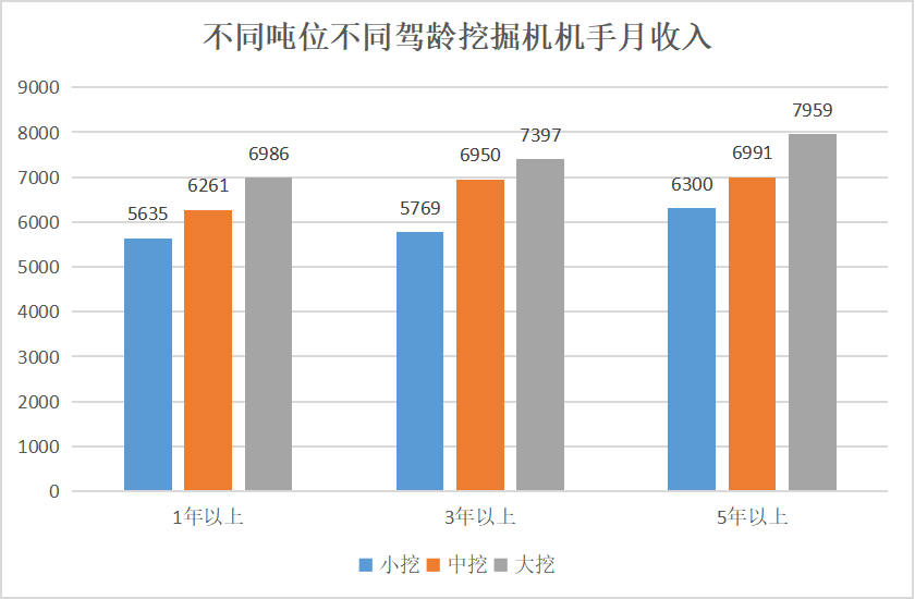 而根据2019年统计的小挖、中挖、大挖操作手不同驾龄的月收入情况来看,驾驶经验是影响挖机机手工资的重要因素。 无论是驾驶小挖,中挖还是大挖,有5年以上经验的机手工资是最高的,平均的月薪资水平在8000元左右,1年以上相对5年以上就低了很多。