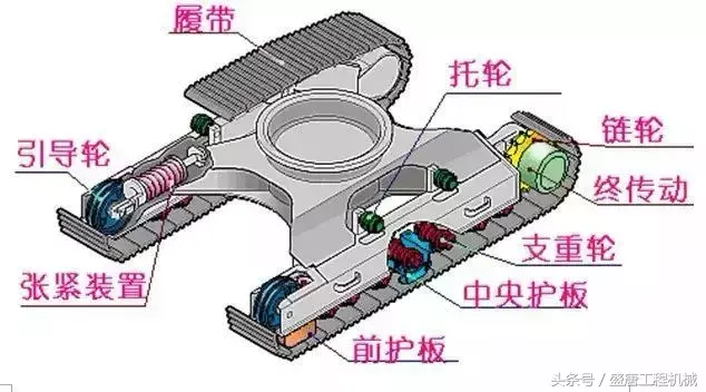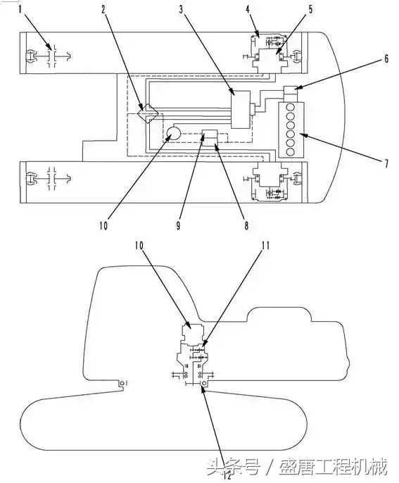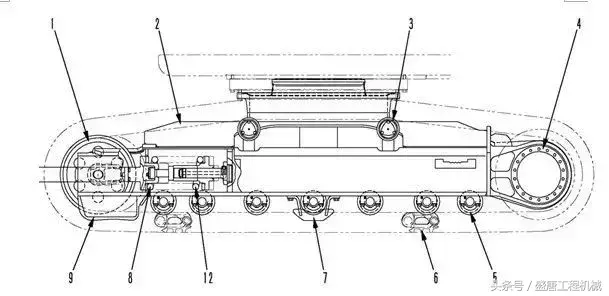 1、引导轮 2、中心回转接头 3、控制阀 4、终传动 5、行走马达 6、液压泵 7、发动机