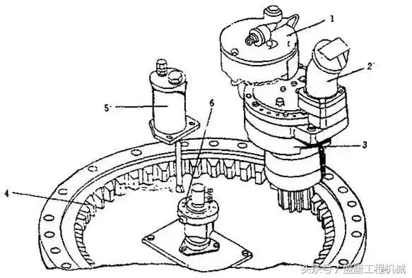 1、制动器2、液压马达3、行星齿轮减速器4、回转齿圈5、润滑油杯、6、中央回转接头