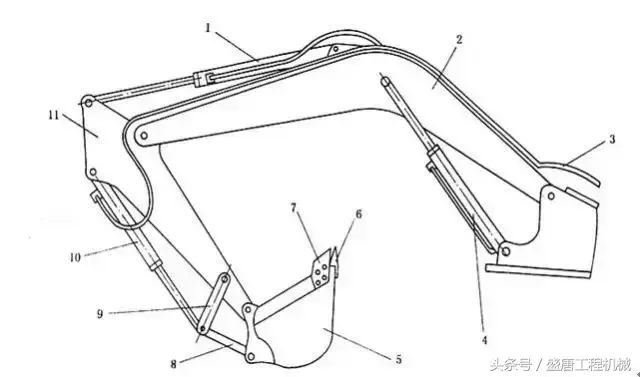 8-连杆;9-摇杆;10-铲斗油缸;11-斗杆