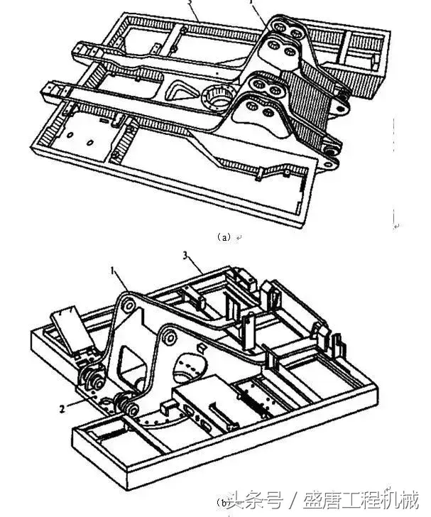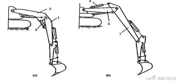 1、下动臂2、上动臂3、连杆或液压缸