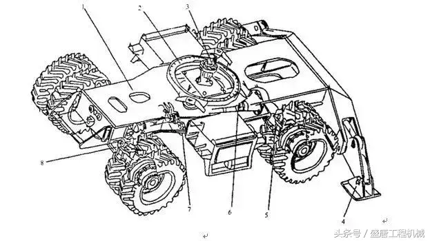 1、车架2、回转支撑3、中央回转接头4、支腿5、后桥6、传动轴7、液压马达及变速箱8、前桥