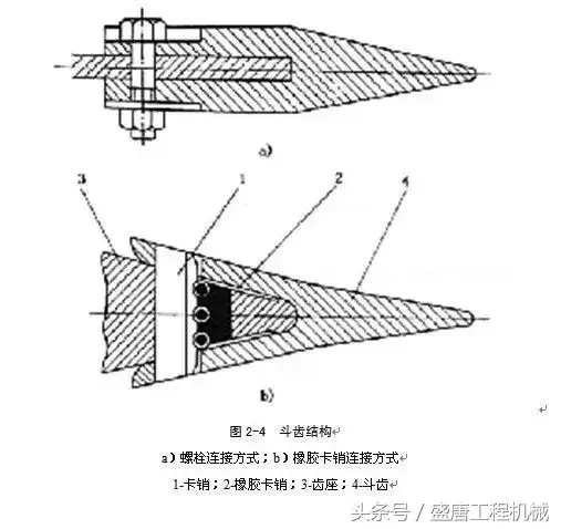 装设斗齿,以增大铲斗对挖掘物料的线压比,斗持及斗形参数具有较小单位切削阻力,便于切入及破碎土壤。斗齿应