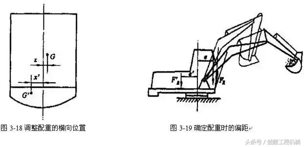 液压挖掘机的布置原则是左右对称,尽量做到质量均衡,较重的总成、部件靠近转台尾部。此外,还要考虑各个装置工作上的协调,维修方便等。有时转台布置受结构尺寸限制,重心偏离轴线,致使左右履带接地比压不等,影响走架结构强度和挖掘机的行驶能,此时可通过调整配重的重心来解决,如图3-18所示,图中x与x’分别为转台重心与配重中心偏离轴线值。
