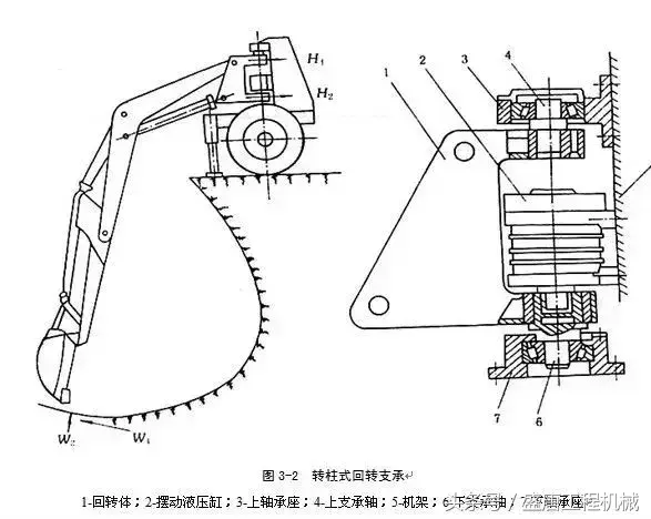 液压挖掘机的回转装置必需能把转台支承在固定部分(下车)上。不能倾翻倒,并应使回转轻便灵活。为此,液压挖掘机都设置了回转支承装置(起支承作用)和回转传动装置(驱动转台回转),并统称为液压挖掘机的回转装置