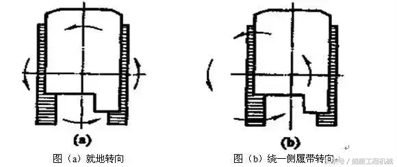 液压传动的履带行走装置,挖掘机转向时有安装在履带上分别有两台液压泵供油的行走马达通过对油路的控制,很方便地实现转向和就地转弯,以适应挖掘机在各种地面、场地上运动。图为液压挖掘机的转弯情况,图(a)为两个行走马达旋转方向相反,挖掘机就地转向。图(b)为液压泵仅向一个行走马达供油,挖掘机则绕着一测履带转向。
