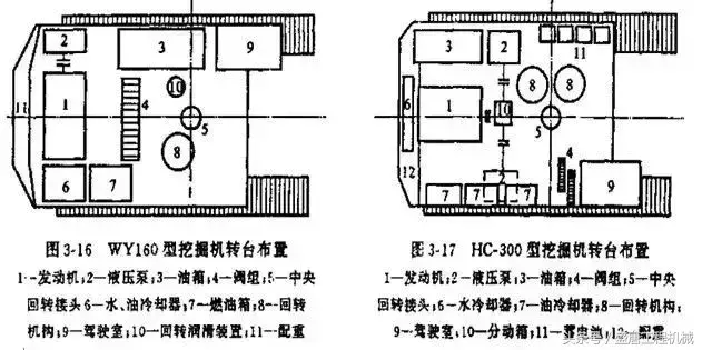 图3-16为国产WY160型全液压挖掘机的转台布置,发动机1是横向布置在转台尾部的图3-17为日产HC-300型半液压挖掘机的转台布置,发动机1是纵向布置在转台尾部的.