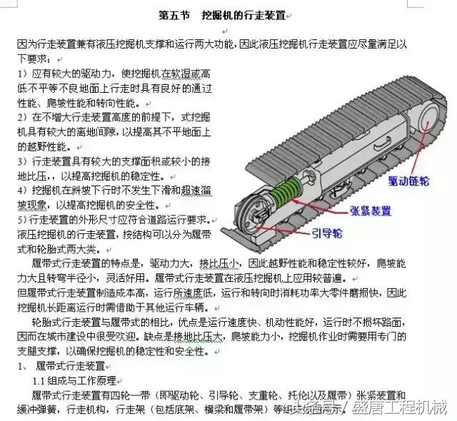 挖掘机运行时驱动轮在履带的紧边——驱动段及接地段产生一拉力,企图把履带从支重轮下拉出,由于支重轮下的履带与地面之间有足够的附着力。阻止履带的拉出。迫使驱动轮卷动履带,引导轮在把履带铺设在地面上,从而使挖掘机借助支重轮沿着履带轨道向前运行。