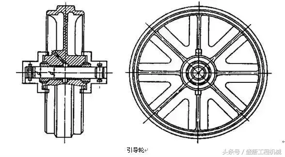 引导轮。 引导轮用来引导履带正确绕转,防止其跑偏和越轨。多数液压挖掘机的引导轮同时起到支重轮的作用,这样可增加履带对地面的接触面积,减小接地比压。引导轮的轮面制成光面,中间有挡肩环做为导向用,两侧的环面则支撑轨链。引导轮与最靠近的支重轮的距离愈小,则导向性愈好。