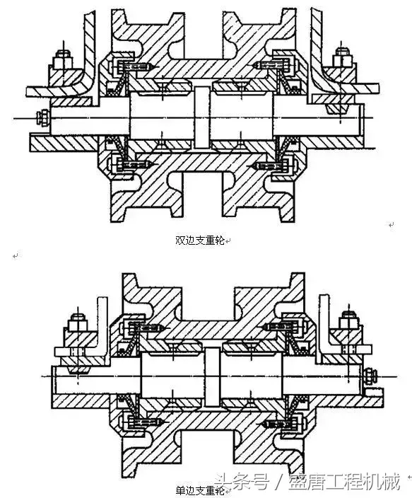 支重轮的结构如上图所示通过两端轴固定在履带架上。支重轮的轮边凸缘,其支持履带的作用,以免履带行走时横向脱落。为了在有限的长度上多安排几个支重轮,往往把支重轮中的几个做成无外凸缘的,并把有无外凸缘的支重轮交替排列。