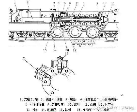 油缸3和引导轮架的支座1、轴2,用螺栓连接成一体,以推动引导轮伸缩,活塞4装于油缸中,油封15封住活塞和油缸腔中的黄油,当从注油嘴16注入压力黄油时,则推压活塞右移,活塞推压推杆18,推杆又推压弹簧前座6、弹簧前座则压缩大小弹簧7和8,这样,在引导轮和弹簧之前就形成了一个弹性体,对履带施加的冲力进行缓冲,消除冲击负荷,减少冲击应力,提高使用寿命,螺塞17是放黄油使用的,当履带张紧度过大时,则慢慢旋转螺塞17,使黄油慢慢挤出,不可一下旋松太多,以免黄油射出伤人。从注油嘴注入黄油压力过大时,可活动推土机作为辅助手段,以使黄油易于注入。