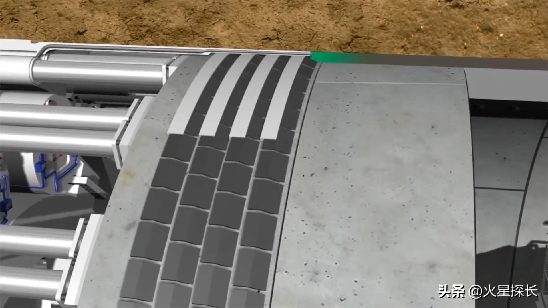 第八步:盾构机在推进大概1.5米后,就暂停!然后电瓶车将事先制作好的管片运至前方,接下来由液压系统将管片抓起,并从下至上依次将6块管片进行对接组装,这种管片具有良好的支撑力和密封性。与此同时,注浆系统会在安放好的管片外面,注入配置好的砂浆,以便让管片能与土壤融为一体,使其更加坚固。