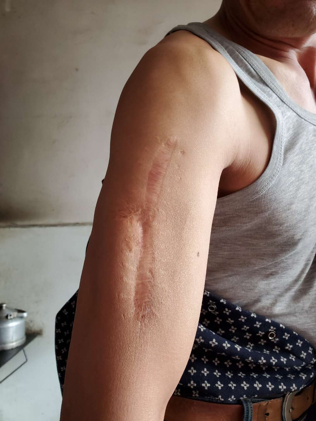 2019年12月13日,孙生寿的右臂仍留有被流弹划过的伤疤。新京报记者 李云蝶 摄