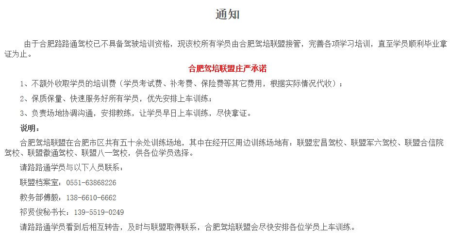7月25日下午,合肥市交通运输管理处驾培科科长陈毛香表示,路路通驾校的事情他们已经得知,主要是因为驾校用地不合相关规定,所以,经开区相关部门要将其收回。