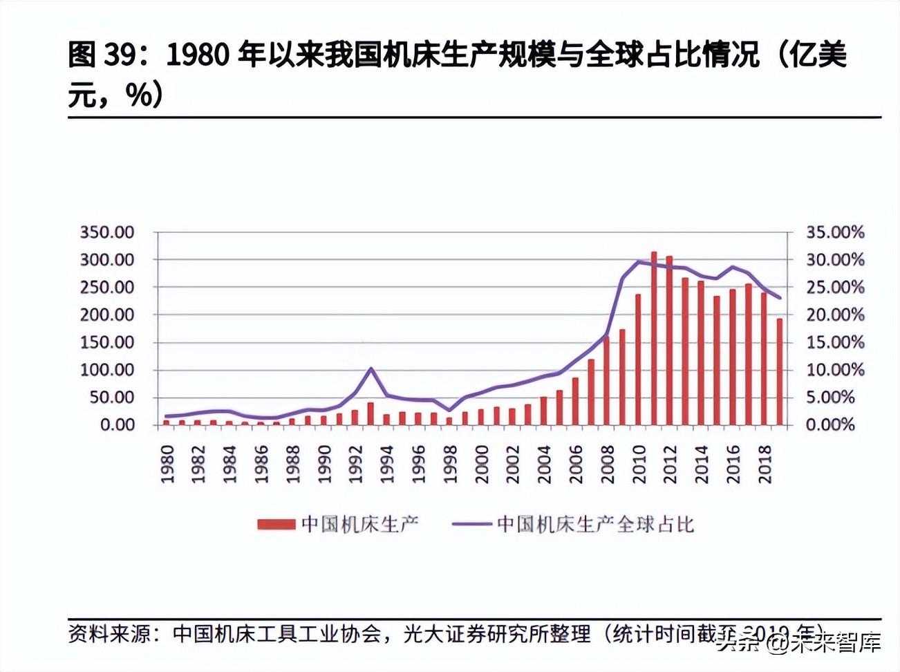 我国制造业“大而不强”的弊端日益凸显,高端机床供需缺口巨大。2000 年后 我国开始承接全球制造业转移,随之我国机床产量和机床消费均呈现高速增长, 2011 年达到历史峰值,2000~2011 年机床消费规模从 49.23 亿美元增长到 436.01 亿美元,CAGR 高达 22.93%;我国机床消费在全球的占比从 9.90%增至 40.62%。另外,根据科德数控招股说明书,2019 年我国数控机床市场规模为 3728 亿元,预测到 2024 年将达到 5728 亿元、CAGR 约为 9%。作为全球第一 大机床消费大国,尽管我国数控机床市场规模增速较快,但我国制造业目前处于 国际制造业生产链的低端,正面临“大而不强”,生产数量多,低附加值,高能 耗,高污染,缺乏核心竞争力和自主创新能力等关键问题。其中,高端数控系统 价值约占高端数控机床成本的 20%~40%,目前国内主要依赖进口,尽管受益于 国家政策的支持,国产化率仍然不足 10%。