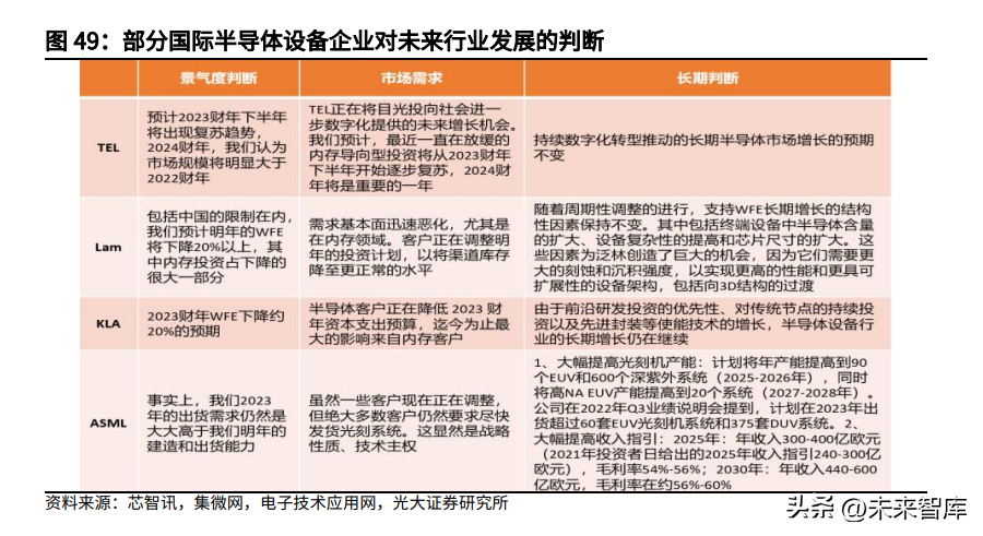 国际半导体设备企业预计 2023 年行业增速下降,但长期仍是趋势上行: (1) TEL:预计 2023 财年(年结日为 09 月 30 日)下半年将出现复苏趋势,2024 财年市场规模将明显大于 2022 财年;持续数字化转型推动的长期半导体市 场增长的预期不变; (2) LamResearch:预计 2023 年 WFE 将下降 20%以上,其中内存投资占下降 的很大一部分。但是,随着周期性调整的进行,支持 WFE 长期增长的结构 性因素保持不变,其中包括终端设备中半导体含量的扩大、设备复杂性的 提高和芯片尺寸的扩大; (3) KLA:半导体客户正在降低 2023 财年资本支出预算,迄今为止最大的影响 来自内存客户。但由于前沿研发投资的优先性、对传统节点的持续投资以 及先进封装等使能技术的增长,半导体设备行业的长期增长仍在继续; (4) ASML 一些客户现在虽正在调整,但绝大多数客户仍要求尽快发货光刻系统。