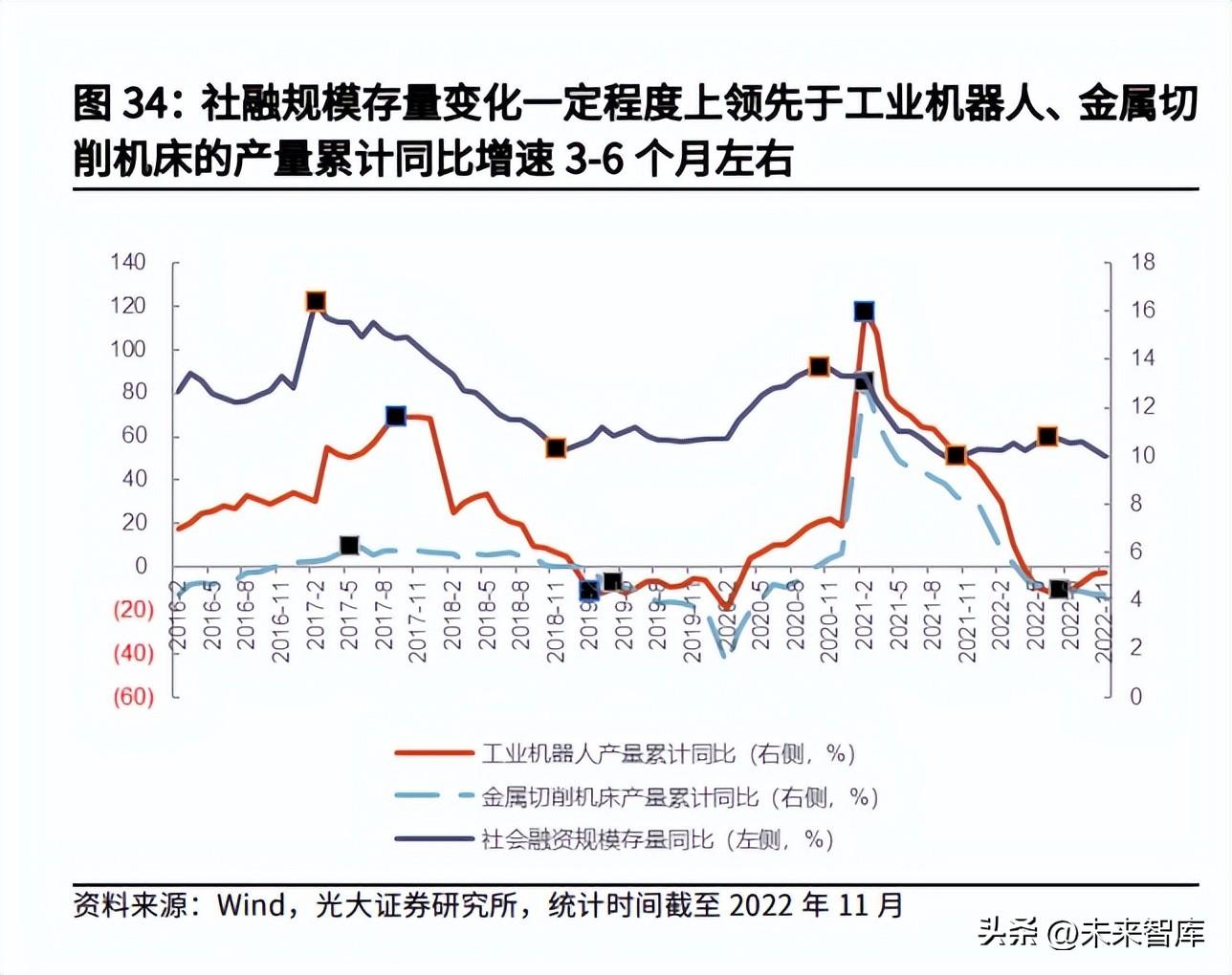 社融作为先行指标,领先行业 3-6 个月。按照央行定义,社会融资即社融,指的 是一定时期内实体经济从金融体系获得的资金总额,用来描述实体经济从金融体 系的借款总额,对全面反映社会总体融资状况具有重要意义。根据观察与统计, 我们认为社融规模存量变化一定程度上领先于工业机器人、金属切削机床(即制 造业固定资产投资额)的产量累计同比增速 3-6 个月左右。 PMI 荣枯线徘徊,底部特征明显。从 2012 年 11 月以来,除去 2020 年 3 月新 冠疫情带来的影响,我国 PMI 指数低于荣枯线有三个阶段,分别是 2015 年 1 月至 2016 年 2 月、2018 年 12 月至 2019 年 10 月、2021 年 9 月至 2022 年 11 月,持续时间分别为 14/11/15 个月;因此本轮持续时间已接近 2015 年 1 月阶 段,我们预计本轮制造业景气度底部特征明显,有望进入复苏阶段。 此外,激光行业受制造业周期波动影响。激光行业是制造业的黄金成长赛道,与 制造业情况息息相关。以上市时间较长的大族激光和华工科技为例,两者的单季 度营业收入同比增长率与 PMI 波动存在一定的相似趋势。因此,PMI 恢复至 50% 以上,昭示着通用自动化行业有望复苏。