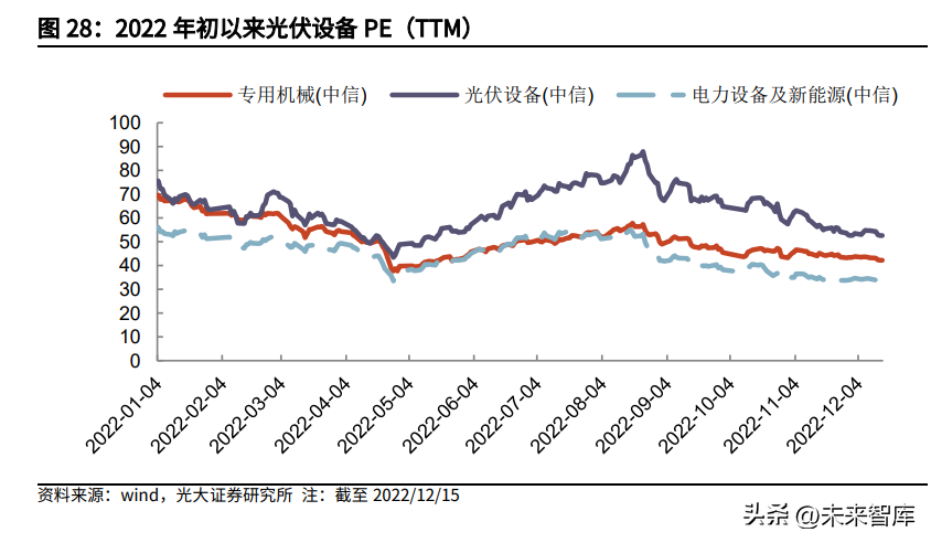 板块估值方面,在电力设备及新能源板块中,光伏设备板块估值水平较高。截至 2022 年 12 月 15 日,中信光伏设备指数 PE(TTM)为 53x,处于年初至今 10.48% 分位数,处于近一年的 9.92%分位数。