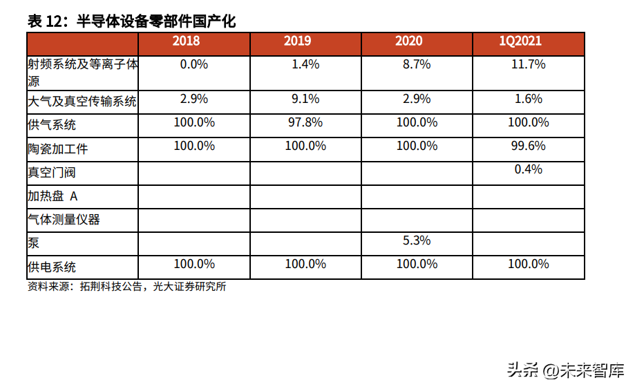 国产设备中,半导体设备的关键零部件的国产化率比较低。根据拓荆科技公告: 拓荆科技 2020 年采购的零部件金额计算: (1) 射频系统及等离子体源的国产品牌份额仅为 8.7%; (2) 大气及真空传输系统的国产品牌份额仅为 2.9%; (3) 真空门阀全部依赖进口; (4) 加热盘 A 全部依赖进口; (5) 气体测量仪器全部依赖进口; (6) 泵的国产品牌份额仅为 5.3%。 以上市公司为例,国内半导体零部件企业覆盖了金属零部件、陶瓷零部件、硅零 部件、石英零部件、真空泵、真空阀门和管道、IGS 零部件、RF 电源、精密运 动控制系统等,且国内半导体零部件企业已拥有众多国内半导体设备客户或本土 晶圆厂客户。