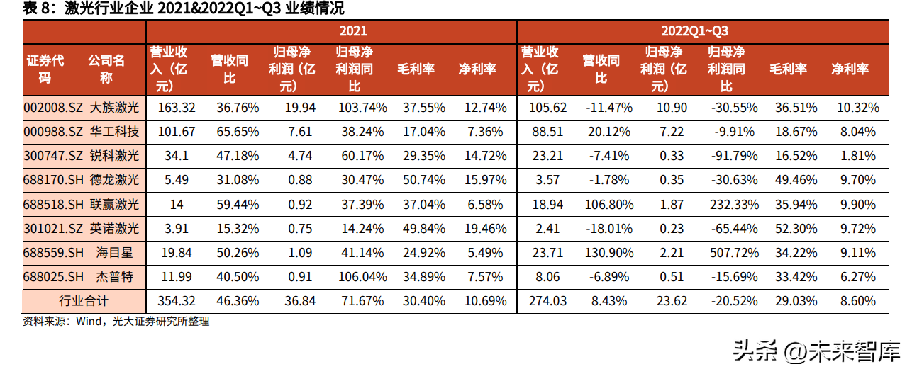 激光行业 2021 年高度景气,2022Q1~Q3 业绩增长放缓,增收不增利。选取 8 家激光行业上市公司代表行业,分别为激光器领域的锐科激光、德龙激光、英诺 激光、杰普特,激光设备领域的大族激光、华工科技、联赢激光、海目星。2021 年上述 8 家激光公司实现营业收入 354.32 亿元,同比增长 46.36%;实现归母 净利润 36.84 亿元,同比增长 71.67%。2022Q1~Q3,8 家激光公司实现营业收 入 274.03 亿元,同比增长 8.43%,实现归母净利润 23.62 亿元,同比下滑 20.52%。 受疫情与价格战影响,毛利率有所下降。2021 年 8 家激光公司的毛利率平均为 30.40%,净利率平均为10.69%;2022Q1~Q3毛利率为29.03%,净利率为8.60%, 均有所下降。一方面,疫情影响供应链与下游需求,叠加原材料价格上涨,盈利 承压;另一方面,市场竞争激烈,技术含量相对较低的产品陷入价格战,进一步 压缩盈利空间。