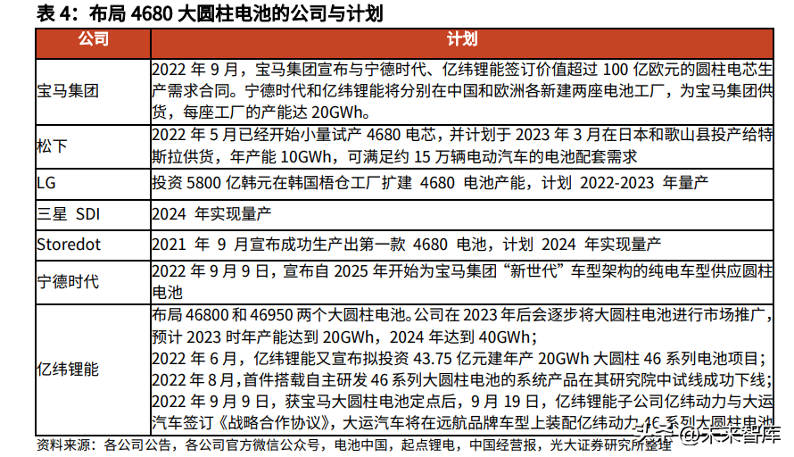 4680 大圆柱电池凭借高能量密度、低成本、高安全性吸引各大电池厂加注资本, 打开激光焊接设备新增长空间。据特斯拉官方说法,相比 2170 电池,4680 大 圆柱电池能量提升 5 倍、输出功率提升 6 倍,每千瓦时的成本降低 14%,搭载 该电池的车型续航里程可提高 16%。4680 电池特殊之处在于采用无极耳技术, 在正负极上布有大量极耳,对激光工艺的要求较方形电池、小圆柱电池高,且用 量更大。目前,在特斯拉效应下,松下、三星、亿纬锂能、比克动力、大众、宝 马等纷纷入局 4680 大圆柱电池。我们认为,未来随着 4680 电池的量产应用, 将进一步扩充激光焊接设备市场空间。