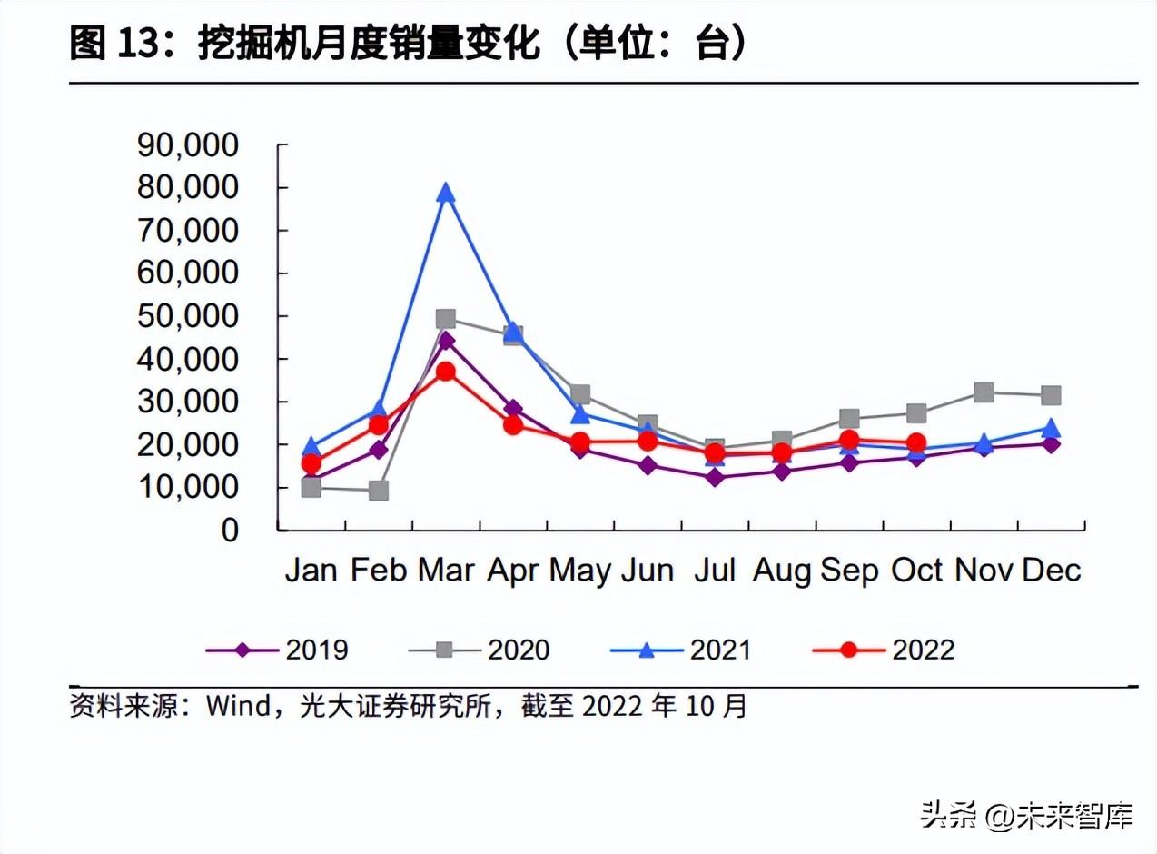 工程机械:行业景气度主要受到基建投资、地产投资、更新换代、海外需求等因 素影响。 (1)“稳增长”政策的实施推动股价上升。2022 年 4 月政府开始实施大规模留 抵退税,政策效应集中释放,当月全国增值税留抵退税约 8000 亿元,相当于去 年 4 月份财政收入的 37.5%。上海疫情的好转也有利于“稳增长”政策的落地。 2022 年 7 月 28 日中共中央政治局会议强调做好下半年经济工作,要坚持“稳 中求进”工作总基调,全面落实“疫情要防住、经济要稳住、发展要安全”的要 求,巩固经济回升向好趋势,着力“稳就业、稳物价”,保持经济运行在合理区 间。 (2)2022 年上半年,工程机械行业国内销量持续处于下行区间,复苏预期不断 后延;工程机械公司的半年报显示,收入与利润率均出现明显下滑,行业呈现继 续下跌走势。 (3)2022 年三季度,国内挖掘机等产品销量月度同比增速转正。工程机械公司 的三季报显示,企业收入、净利润降幅收窄,出口市场稳中向好,对提振市场信 心具有帮助。