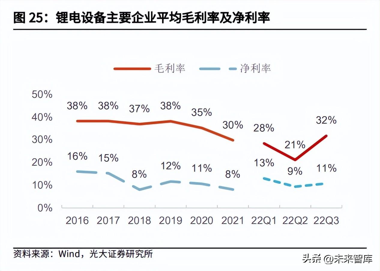 盈利能力改善明显,期间费率降幅显著。下游扩产持续,锂电设备公司自身产能 建设进展顺利,在手订单逐步转化为收入确认,营收规模大增,拉动整体毛利率、 净利率水平的提高。2022 年第三季度,本次统计的 11 家锂电设备公司平均毛利 率水平大幅跃升至 31.7%,平均归母净利率水平为 10.83%,环比改善 1.44pct。平均期间费用率大幅下降,2022 年第一季度为 26.81%,2022 年前三季度为 21.22%。