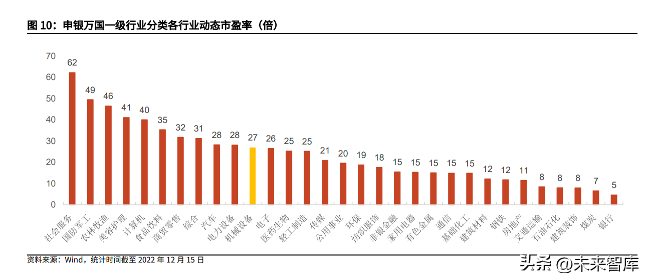 截至 2022 年 12 月 15 日,机械设备板块市盈率(TTM,剔除负值)为 27 倍, 在 31 个行业中排名第 11 位。
