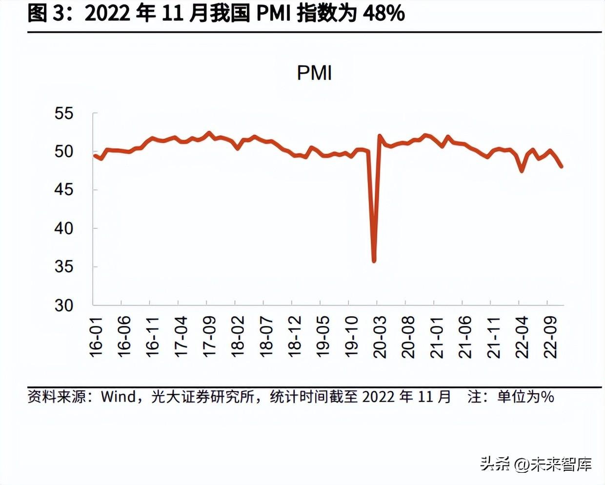 2022 年 11 月份 PMI 指数再度转弱至收缩区,底部反转或将至。2022 年 11 月 制造业 PMI 指数为 48%,前值 49.2%,环比下降 1.2pct,位于收缩区间。11 月产需两端的生产指数和新订单指数分别为 47.8%和 46.4%,环比变动 -1.8/-1.7pct,产成品库存指数环比上升 0.1pct 至 48.1%,原材料库存指数下降 1pct 至 46.7%,开工有所加快,但实际需求持续偏弱,后续需要刺激与稳定经 济一揽子政策的落地推动。