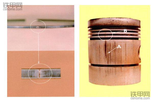 左:严重划伤的活塞环;右:严重划伤的活塞面
