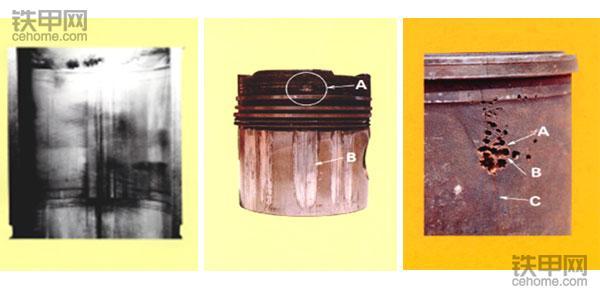 从左至右:因冷却不良而严重烧坏的缸套;因冷却不良而严重烧坏的活塞;缸套壁严重腐蚀
