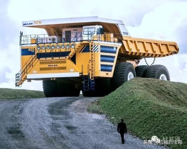 世界上最大的卡车BELAZ-75710,由白俄罗斯BELAZ制造,全车长20.6m,宽9.87m,高8.165m。有效载荷450吨,自重360吨,全重810吨。承载量相当于300辆福特福克斯,或者是37辆双层公共汽车,全重相当于2头蓝鲸的重量。