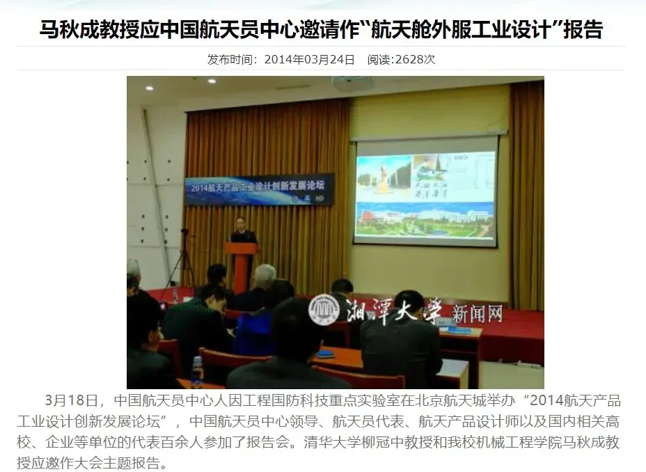 出于好奇,乔叔扒了扒湘大的新闻网,没有想到,在2014年3月24日一篇文章赫然让我眼前一亮,题名正是《马秋成教授应中国航天员中心邀请作“航天舱外服工业设计”报告》。