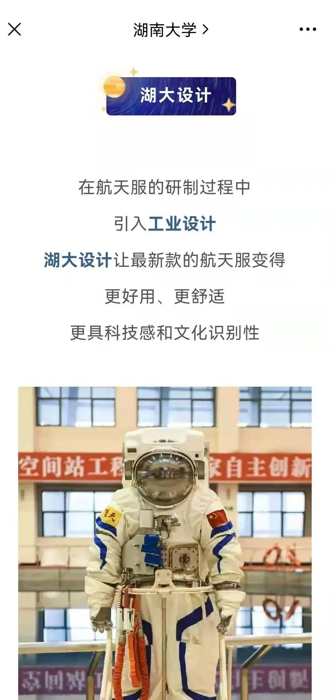 “新一代舱外航天服的工业设计任务,由我校(湖大)设计艺术学院助理教授罗建平领衔的智能装备科研团队承担”