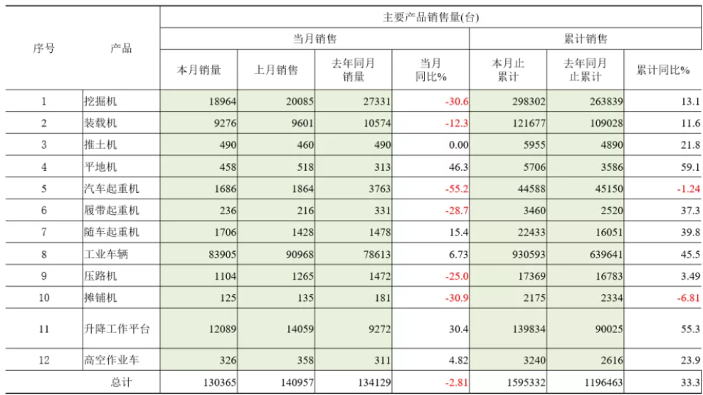 (数据来源:中国工程机械协会数据 1-10月份各分类产品销售情况)