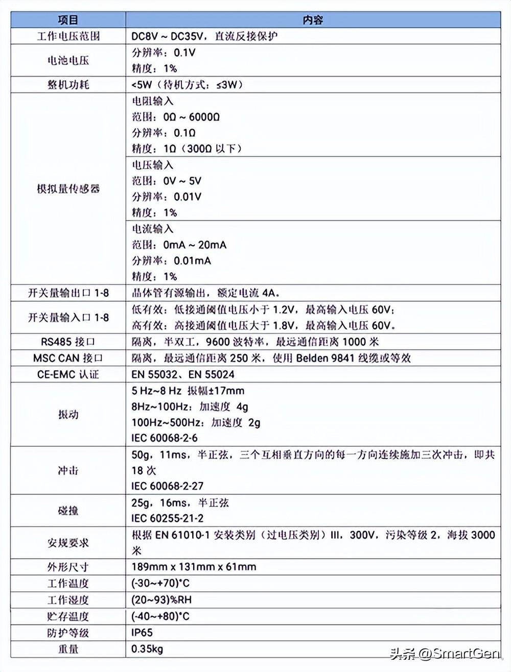 4.3吋彩色液晶显示屏,分辨率为480x272,背光亮度可调,中、英及其他语言显示,显示界面可选;4种调速方式(按键调速、电位器调速、油门调速、按键+油门调速)可选择;3种起停机控制方式:控制器按键起停机控制;输入口远程起停机控制;外部钥匙起停机控制;具有怠速/高速切换功能,且高速值可记忆,方便回到上次调节后的转速;2路PWM输出,可实现工程机械设备中液压比例阀驱动控制;具有钻车换杆控制逻辑,可实现钻车手动换杆操作;8路开关量有源输出(晶体管);8路关量输入(自定义低电平或高电平有效);6路模拟量输入(3路固定电阻型,另外3路可定义电压型、电阻型、电流型);多达15项维护保养记录功能,并可自定义维护名称;三种起动成功条件(转速、机油压力、转速+机油压力)可选择;前面板采用硅胶面板+硬屏亚克力,外壳密封设计,整机防护达到IP65等级;具有历史记录功能(200条),并可记录ECU报警的SPN 码;具有USB、RS485、CANBUS接口;DC +5V 输出;应急开机;满足欧V标准的发动机,具有DPF再生功能;自定义开机界面;负载率过高保护;控制器采集的模拟量信号可通过CAN总线上传;密码锁机;仪表模式;尿素液位低警告、报警;发动机升、降速率;加热器、冷却器控制;ECU信息智能显示;加载控制(可选择3种配置模式);自定义组合输出;自定义时间断输出;HEM4300性能参数