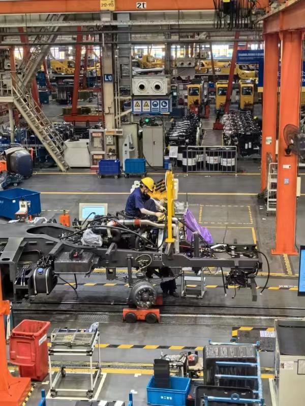 徐工重型装配一分厂中小吨位底盘装配线上,员工在装配吊臂支架。林琳摄