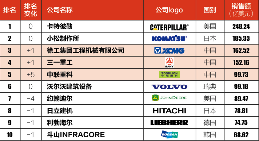 全球工程机械制造商50强榜单发布 徐工、三一、中联齐进五强