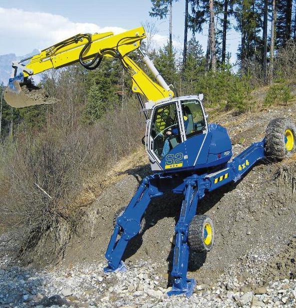 特点:灵活性较高,可以在公路上行走,但爬坡能力差,泥地不能用,适于硬地施工。