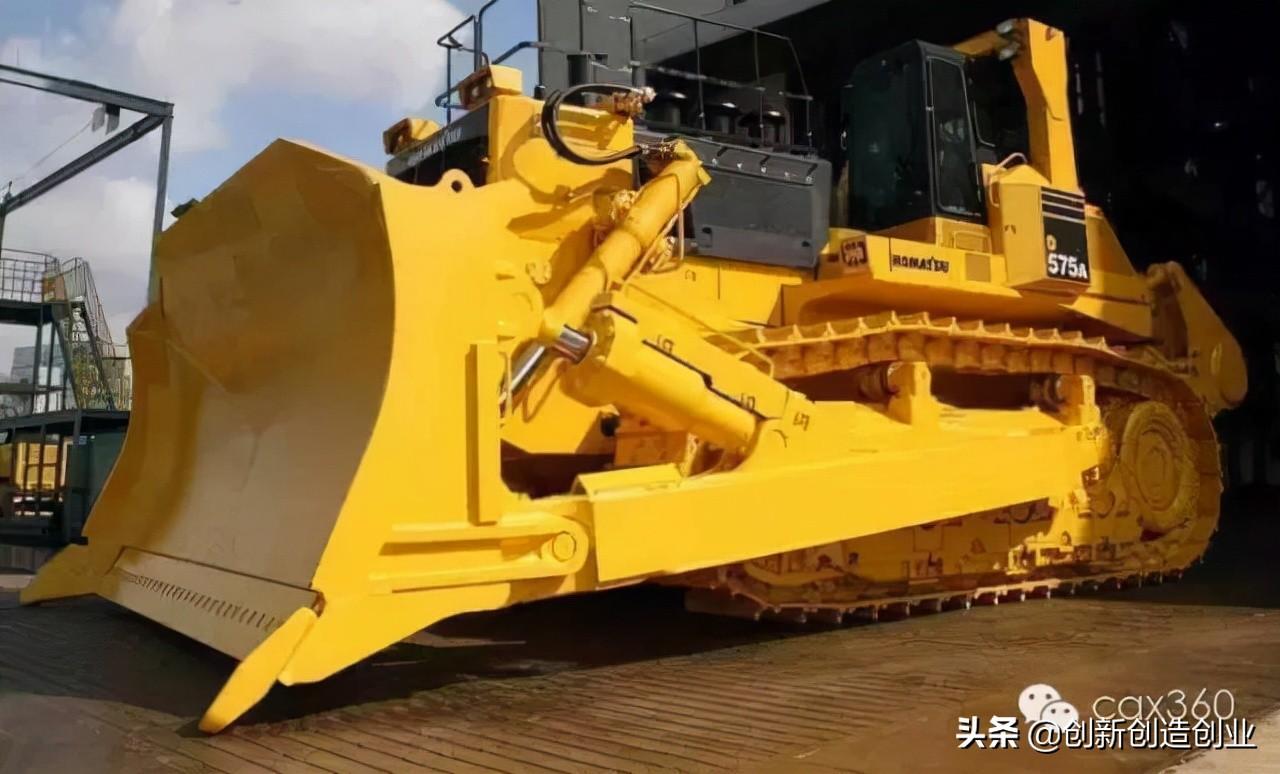 这是目前全球在产的最大推土机,最新型号为D575A-3SD,发动机是排量46.3升的Komatsu SA12V170E(12缸涡轮增压)柴油机,燃油箱容量为2100升,变矩器带自动锁止功能,有三个前进档和三个后退档,最大前进速度11.6 km/h,最大后退速度13.3 km/h。