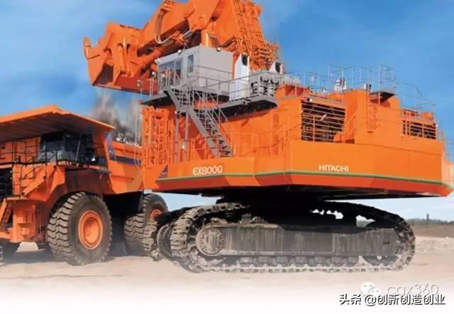 日立EX8000操作重量达780吨,操纵室的顶部部分距地面达10米,铲斗容量有40立方米,伸举最高可达8层楼,约20米高。其巨大的挖掘部分比普通挖掘机要重一倍还多,一次铲掘量约相当于6台11吨自卸卡车的装载量,4铲斗大约可装2辆300吨级翻斗车。