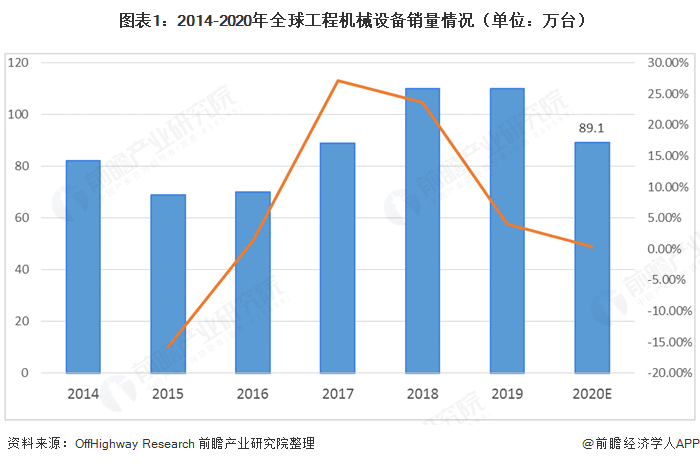 整体来看,全球工程机械设备销量呈上升趋势,特别是在2018-2019年,行业出现了峰值,均超过110万台。根据OffHighway Research的报告,2020年由于新冠肺炎疫情的影响,2020年将下降至89.1万台,同比下降19%。