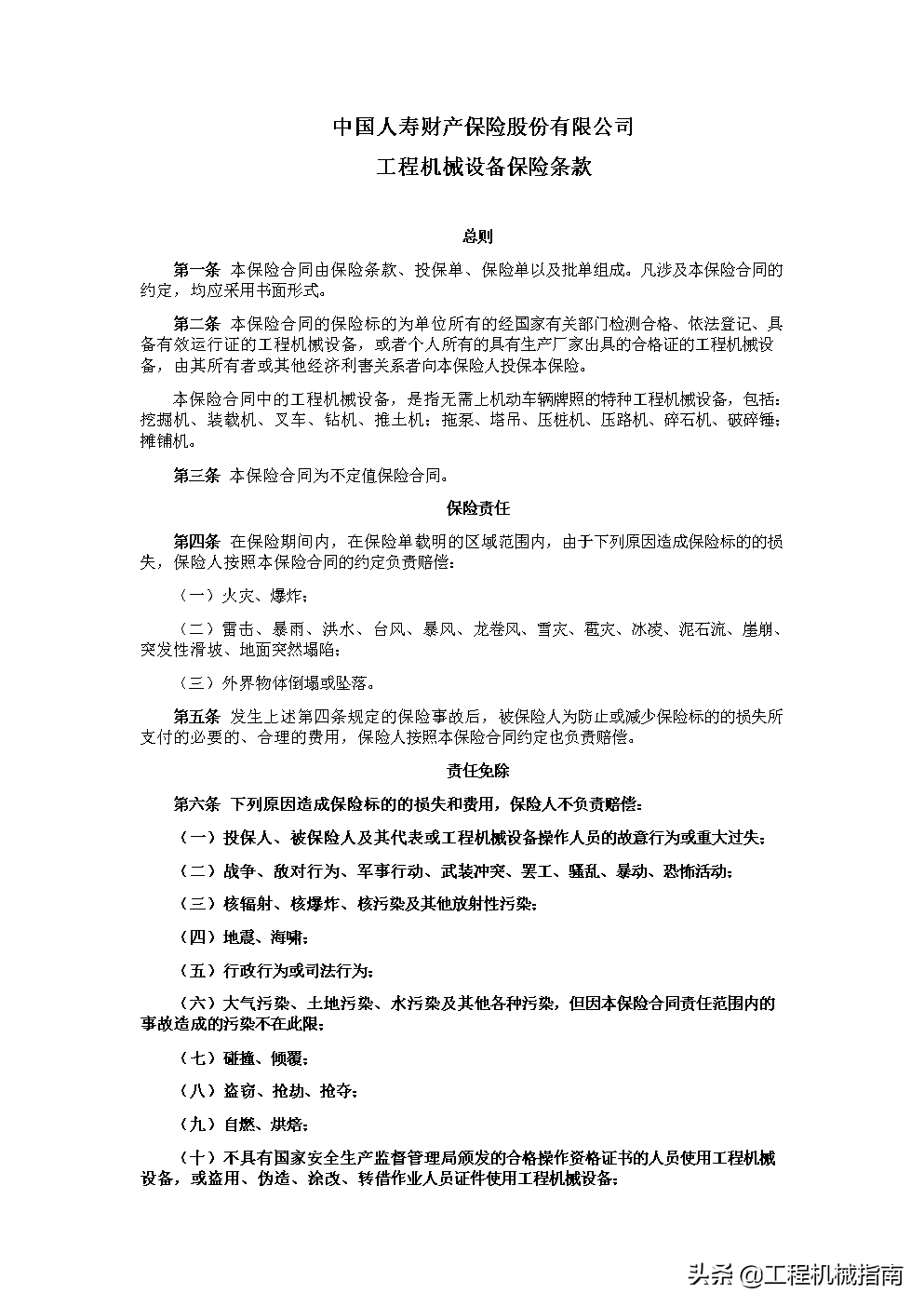 本保险条款中的工程机械设备是指无需上机动车辆牌照的特种工程机械设备,包括以下