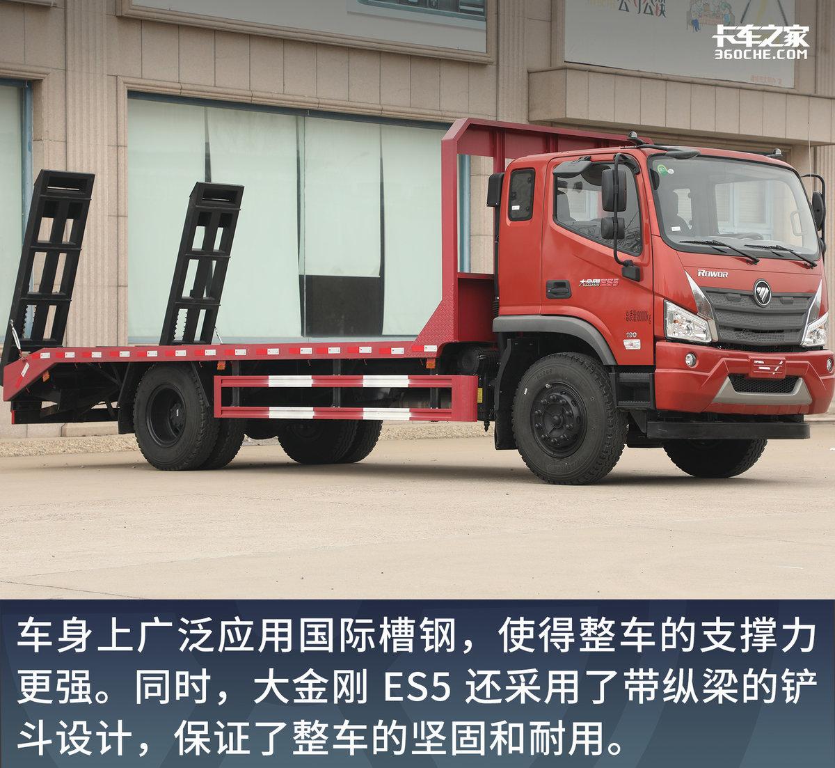 值得一提的是,大金刚ES5低平板运输车采用了福田瑞沃深度定制开发的专用底盘,针对低平板运输场景进行深度定制化开发,满足全工况工程运输,保障高效出勤。