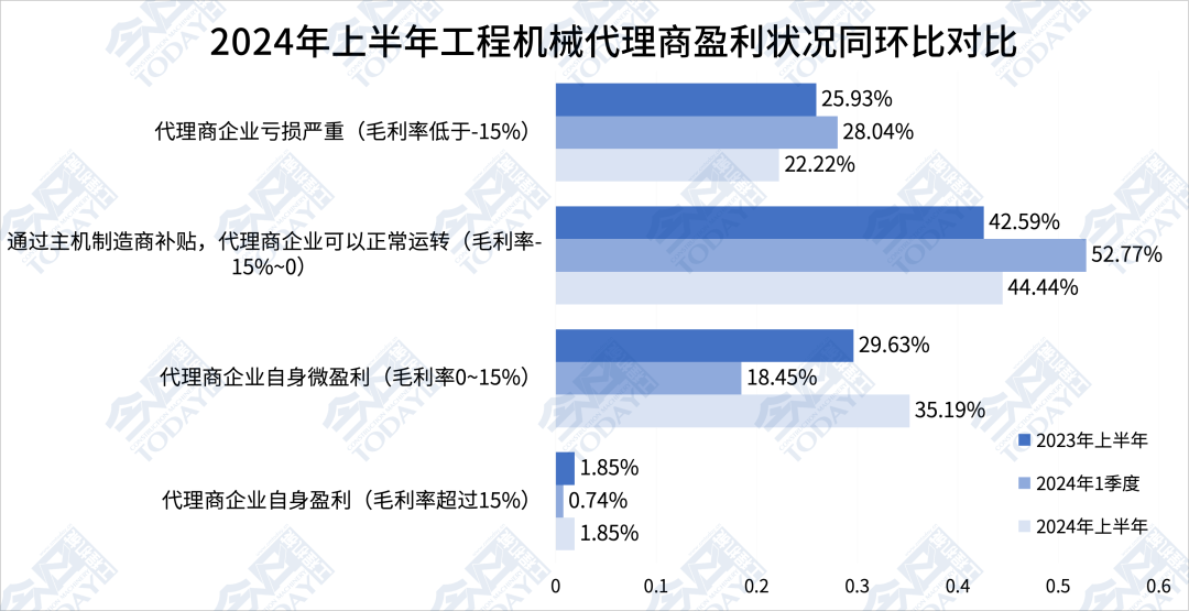 综合2024年上半年的数据来看,叠加国内工程机械市场下行周期筑底过程的高内卷压力,部分渠道市场占有率或销量考核指标权重仍然较高、恶性竞争等多方面因素的挑战,在广大工程机械代理商群体主动求变、积极调整,特别是采取了改善组织架构、精简人力资源和拓展后市场等转型升级举措,努力提升和强化渠道的能力和价值之后,在上半年小有成效,但不排除制造商渠道政策的调节在这其中起到了一定的作用。同时,由于国内市场复苏进程的差异性,特别是部分市场仍处于筑底过程的徘徊区间中,代理商群体的盈利情况仍然不容乐观。