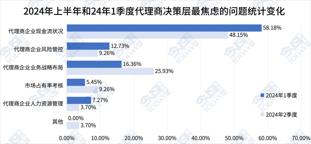 从代理商决策层最焦虑的核心问题看,现金流问题无疑是最首要要解决的,占比为48.15%。相比24年一季度,本季度现金流状况、企业风险管控、代理商企业人力资源管理的选择比重分别降低了10.03、3.47和3.57个百分点;而企业业务战略布局、市场占有率考核的选择权重分别提高了9.57和3.81个百分点。
