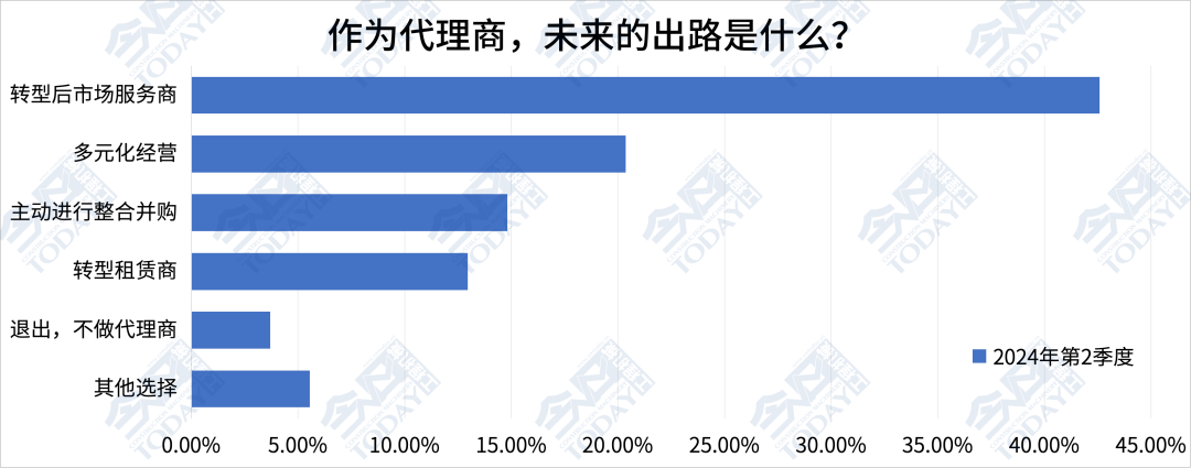从未来出路的反馈情况来看,42.59%的代理商企业选择转型后市场服务,对比24年一季度调研数据增加4.41个百分点;20.37%的代理商企业选择多元化经营,环比减少8.72个百分点;14.81%的代理商企业选择主动进行整合并购,环比增加2.08个百分点;12.96%的代理商企业转型租赁商,环比增加2.03个百分点;3.70%的代理商企业选择退出不做,环比增加1.88个百分点。