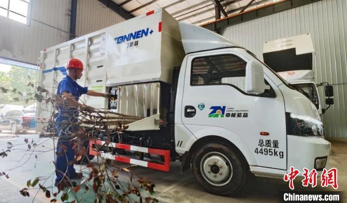 中新网长沙7月21日电 (蒋炼 唐小晴)一大截树杈枝丫和枯树干从进入车厢侧翻盖上的垂帘进料口里快速粉碎后成为小片块状木屑,整个过程不到一分钟。这是长沙中能装备制造有限公司(以下简称“中能装备”)研发的树木削片粉碎车正在作业。整个过程通过视频直播对外展示了国产化园林绿化废弃物处理新装备的“本领”。